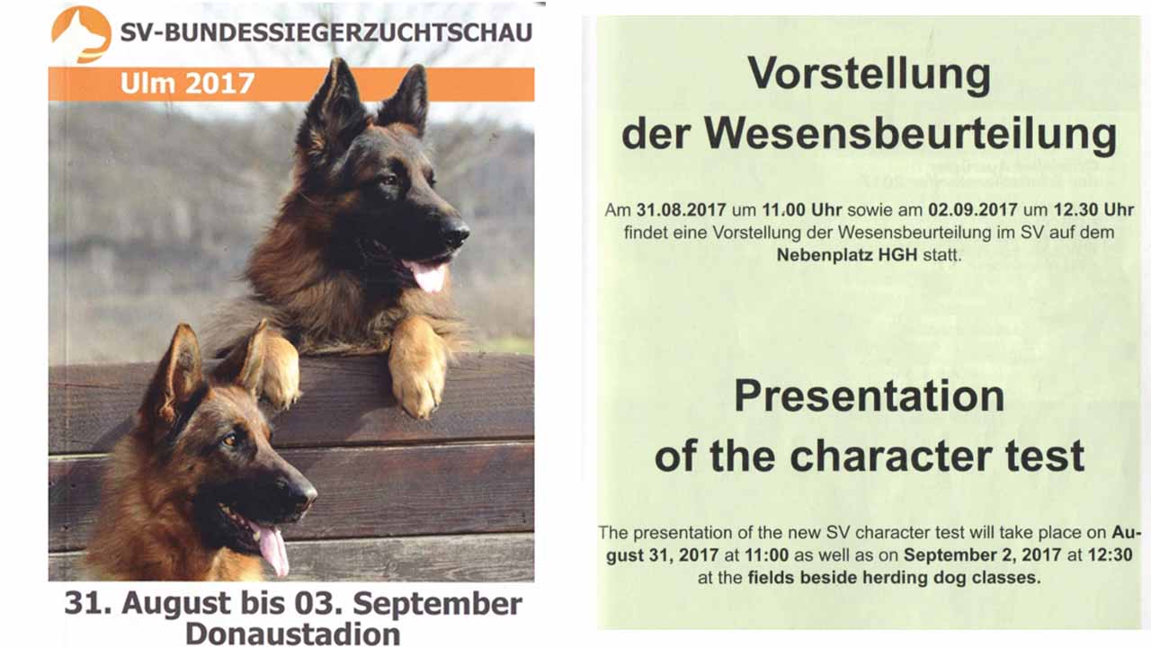 El jueves 31.08.2017 en Ulm-Alemania, durante el Campeonato de Crianza - SV, se presentó a los asistentes de más de 50 países, la denominada Prueba de Carácter (Wesensbeurteilung-WB).
